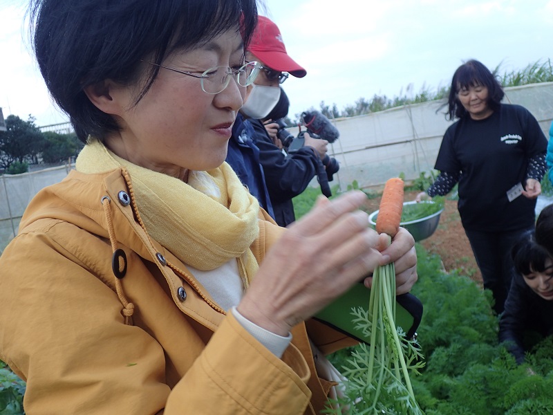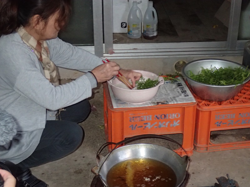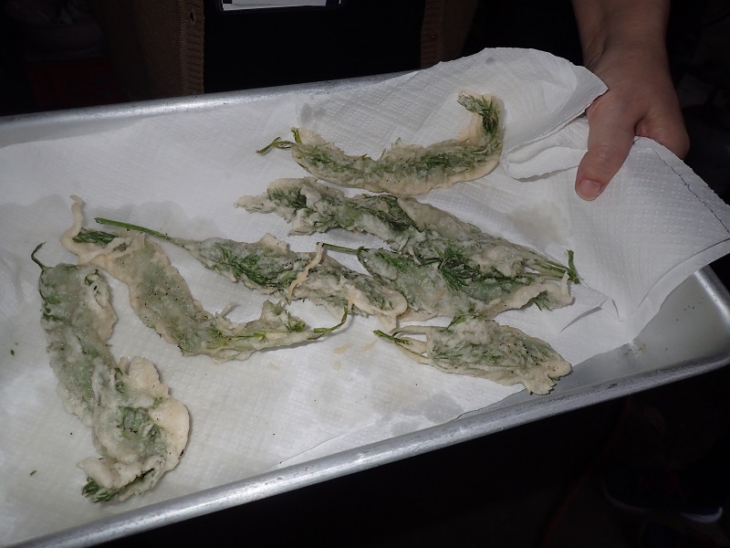 皆さんと収穫しましたニンジンの葉は、すぐに天ぷらにして頂きました。沖縄の天ぷらは、餅粉と小麦粉を半々に合わせるのだそうです。