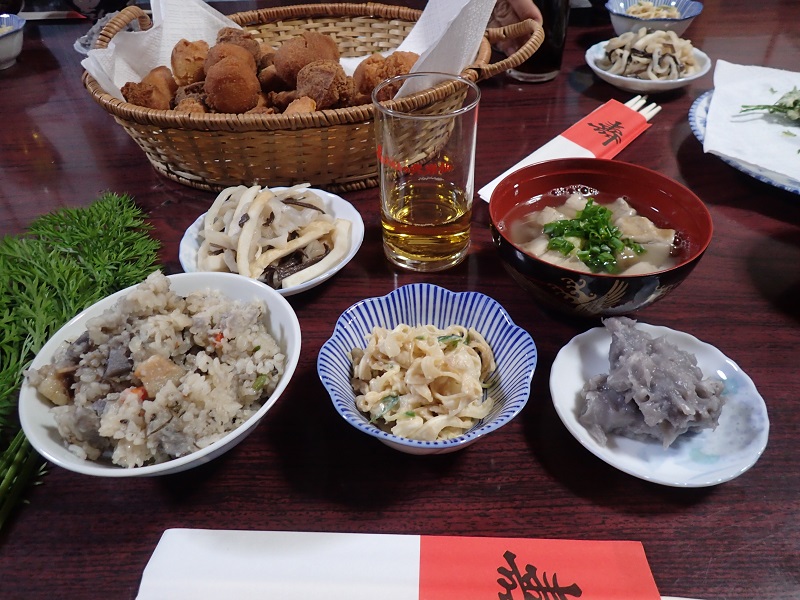 心のこもったお料理の数々です。タイモの炊き込みご飯、ミミガーの和え物、タイモのデンガク、切り干し大根とかまぼこの煮物、ナカミ汁。