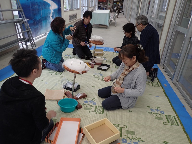 ショール染めの合間には、糸紬ぎも体験しました。