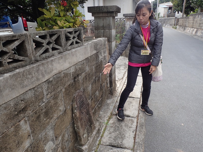 写真は、「石敢當(イシガントゥ)」と呼ばれる魔よけの石碑の説明をしてくださっているところです。
