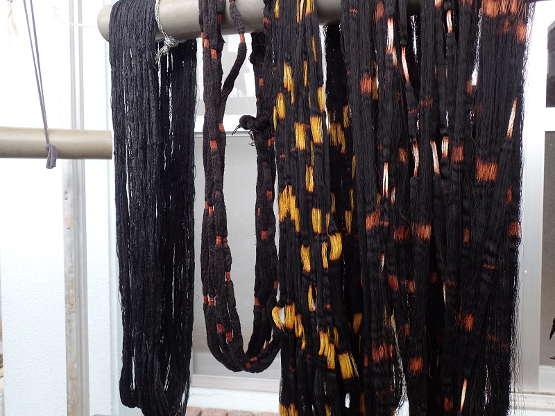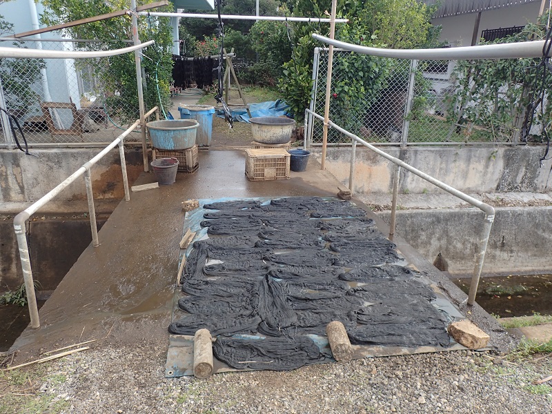 初めにサルトリイバラ(グールー)の染液に50回~60回漬けては干して風に当て、を繰り返します。次に、シャリンバイ(テカチ)の染液に同じく50回~60回漬けては干して、、を繰り返した後に(この段階で120回ほどの工程を経ていますね)泥液に漬けます。そして干した後でまたシャリンバイの液に戻して20回ほど漬けては干して、を繰り返し、また泥に漬けます。さらにもう一度シャリンバイの液に20回漬けて干してを繰り返してから泥に漬けます。。