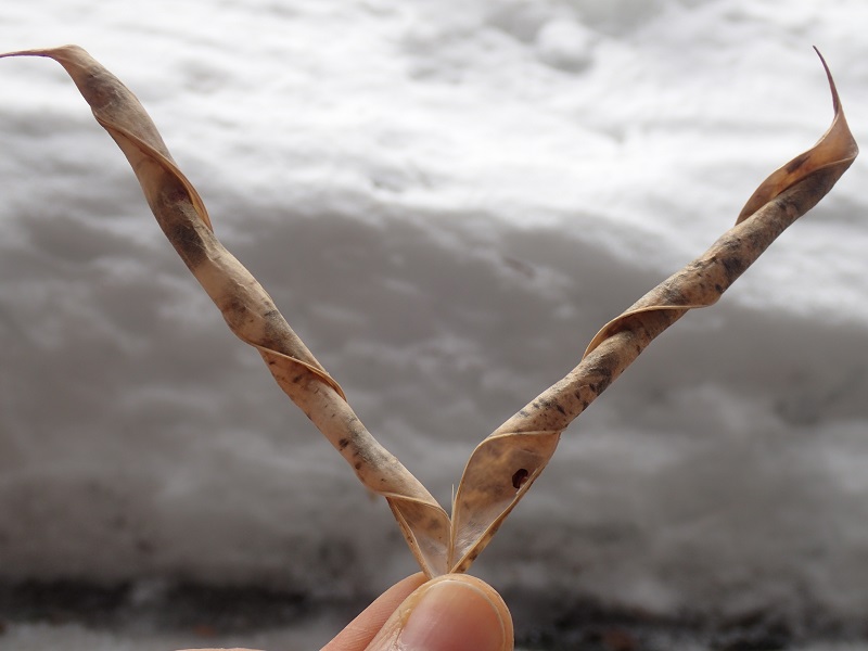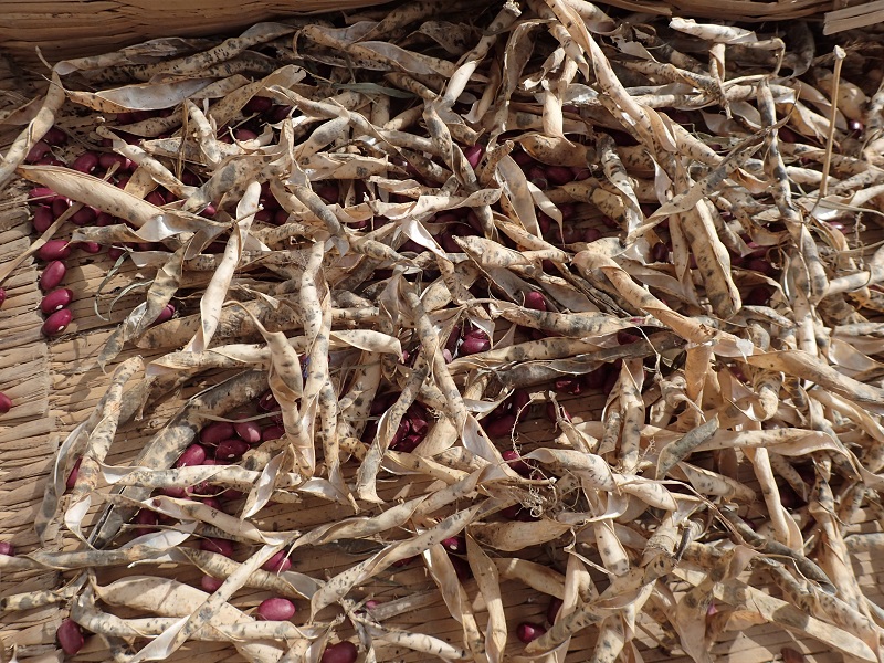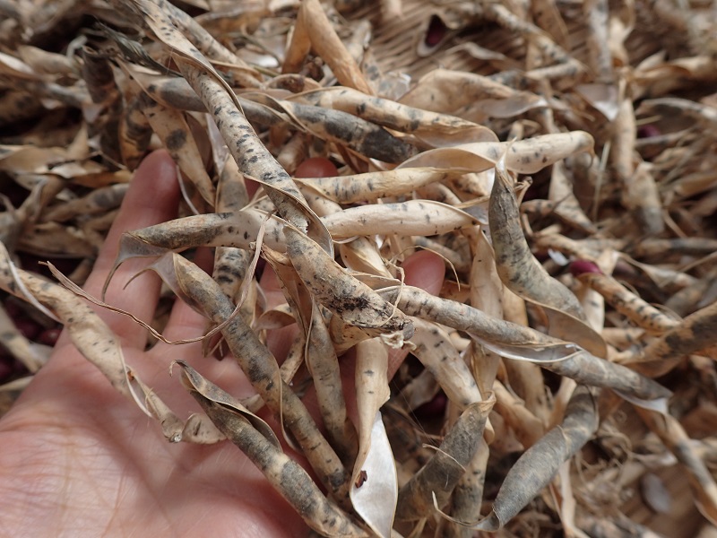 すると、完全に自然乾燥されたのでしょう、インゲンの鞘はクルクル巻きとなって中の豆をほとんどはじき出していました!
