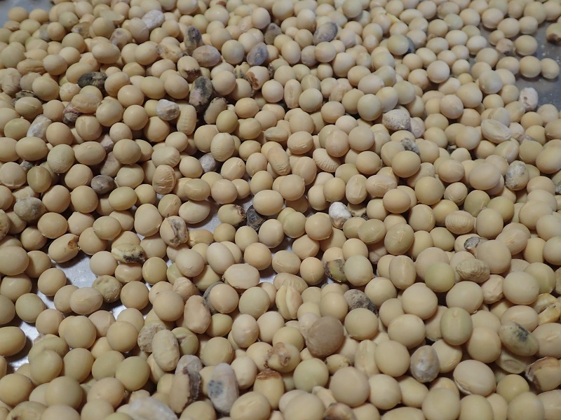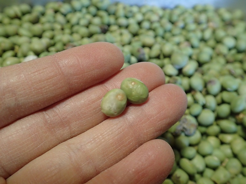 緑色の濃い「あやみどり」という品種の大豆を選別したのですが、いやはやなんともカメムシの吸い痕(吸汁痕)の多いこと多いこと。。大豆が枝豆の頃に、その甘い汁を吸いに来た痕なのですね、、、
