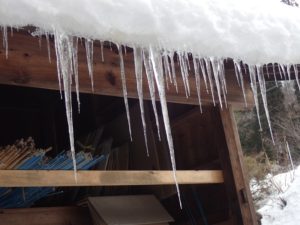 さて、、小屋の屋根から垂れ下がりました鋭いツララ、、、