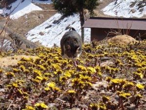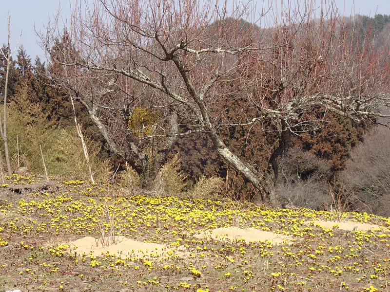 農楽里ファーム母屋裏のフクジュソウ畑を、チビ太と一緒にお散歩して来ました。