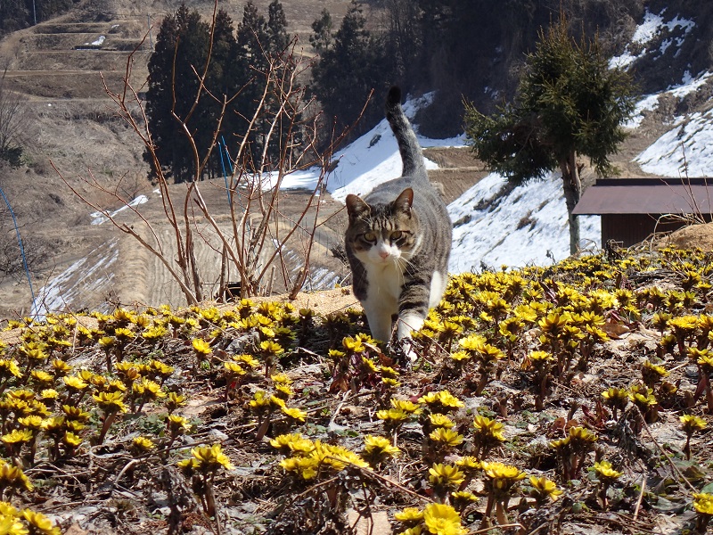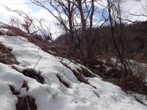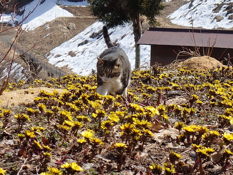 フキノトウの様子はどうかな、、と集落を一回りしてきたのですが、日当たりの良い斜面に少し生えたものはすでに誰かに採られてしまった模様、、毎年たくさん生えてくる斜面は、このようにまだ雪に覆われていました。