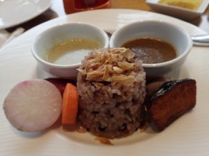 農楽里の古代米ミックス入りライスのカレー(グリンカレーにレッドカレー)!