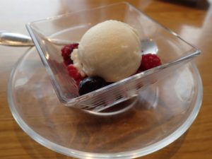 デザートは、ラズベリーとブルーベリーを添えた豆乳バニラアイス!