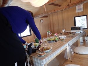 お昼ごはんは、発芽酵素玄米ご飯に信州の郷土料理おぶっこ、採れたての山菜料理等、、