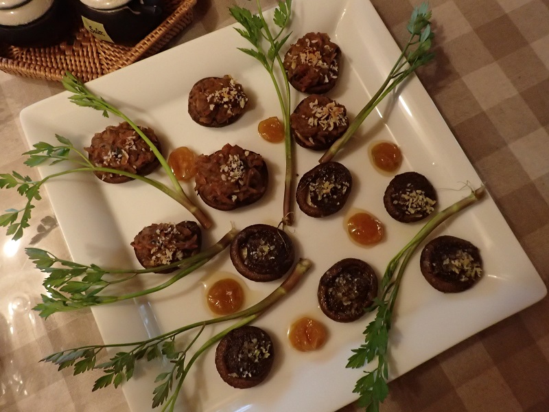 シイタケにフキノトウのジェノバペーストと根菜類とトマトのボロネーゼをのせオーブン焼きには、食養ホオズキのジャムとセリを飾りました。