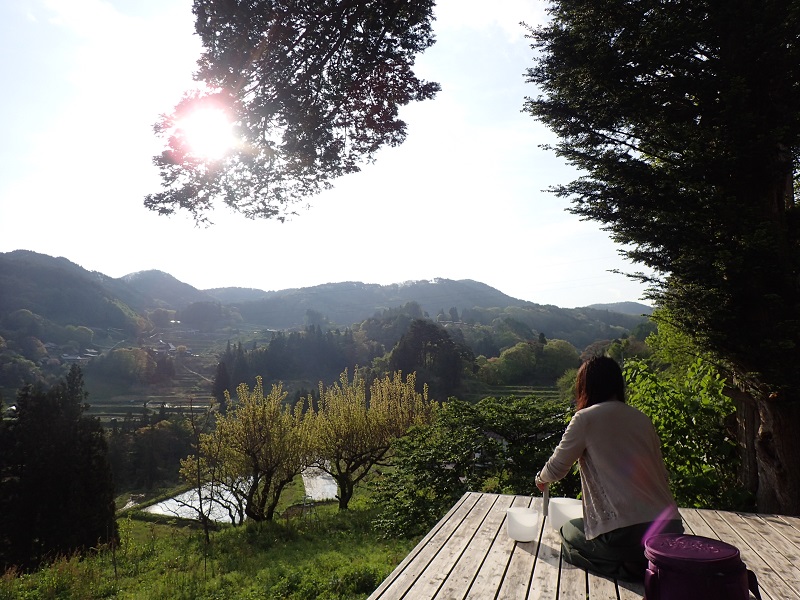 昨日無事合宿を終えました武藤多絵さんが、その清々しい空気の中ウッドデッキにてクリスタルボウルの演奏をして下さいました!