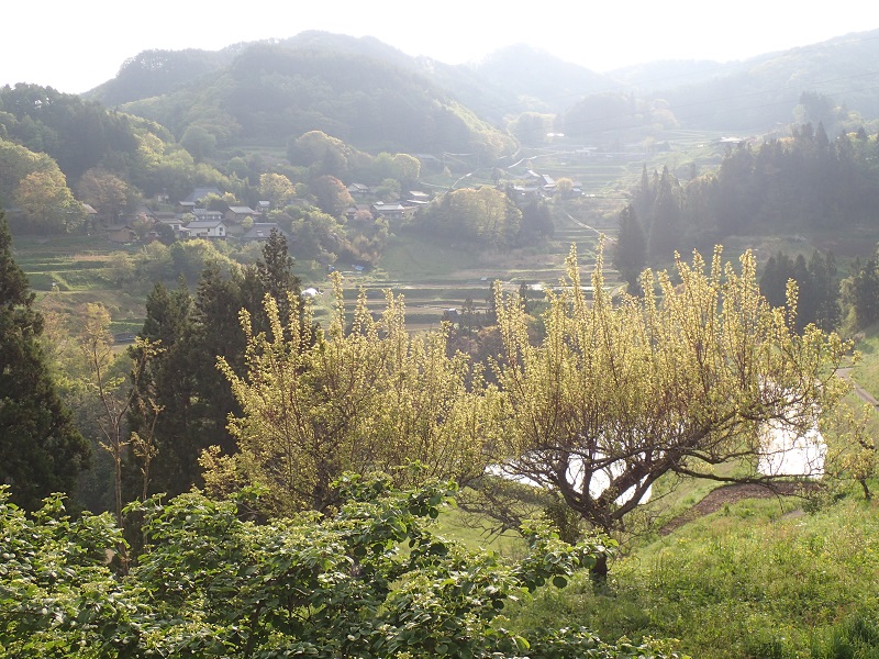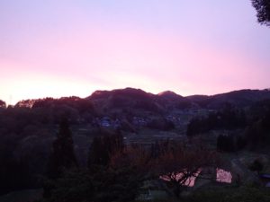 集落の棚田にも朝陽が映り、代搔きを終えた水面がピンク色に染まりました。。