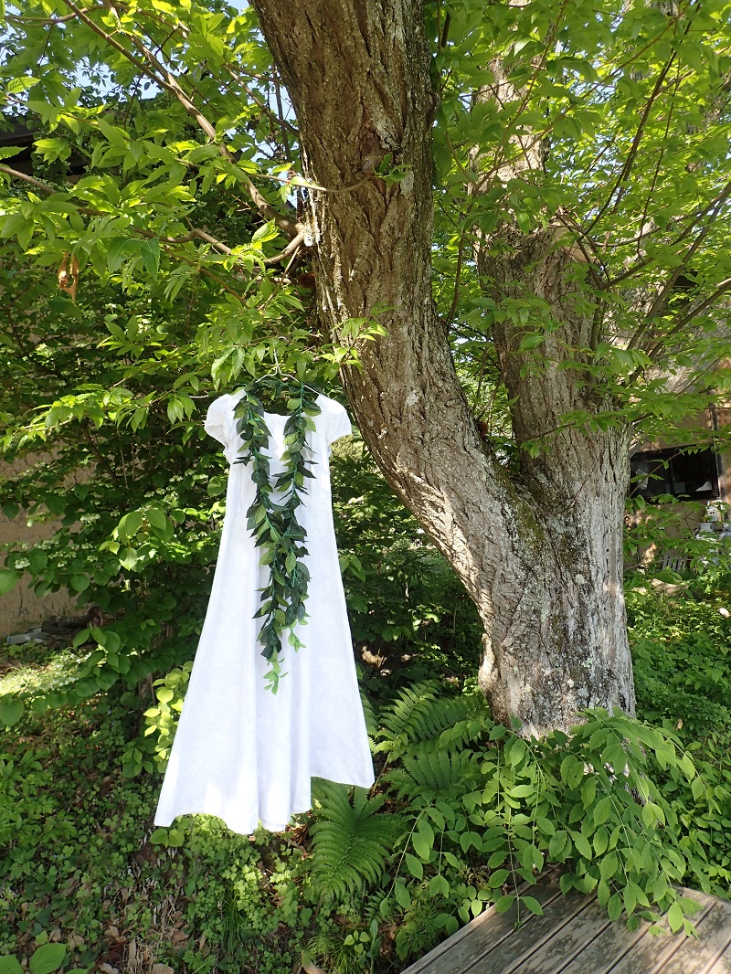 そこで昨日着用しました純白のドレスを、樹齢百数十年の大きな栗の樹の下で陰干ししています。。