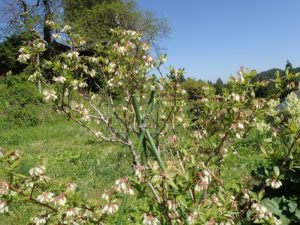 ブルーベリーの株元の草刈りをしていましたら、ヒヨドリがさっと飛んできて花をついばんで飛び去って行きました!