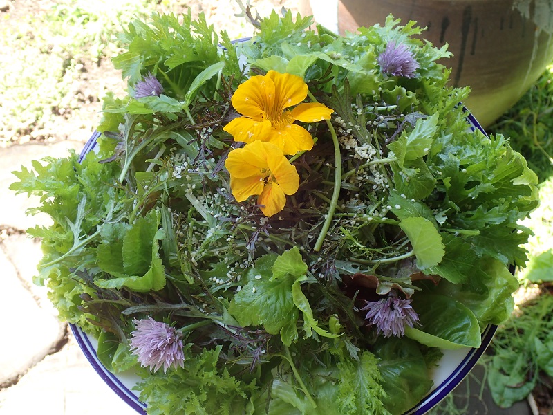 リーフレタス類に赤水菜に水菜、わさび菜に野生のミツバなどなど、、
