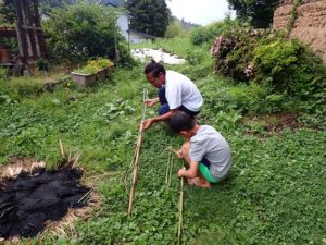 最初は難しそうにしていましたが、ほどなくコツをつかみスイスイと歩けるようになりました!田草取りをしたり、雨後の勢いで母屋の周りに生えてくるハチクの退治をしたり、大根やキャベツの収穫をしたリ、台所ではお母さんと一緒にお得意のお料理も披露してくれました!
