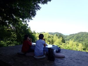 ウッドデッキでくつろぎながらお茶を飲むお2人です。。