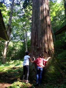 御神木の杉の樹にハグするお2人です。