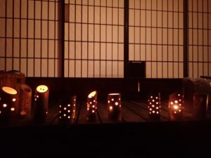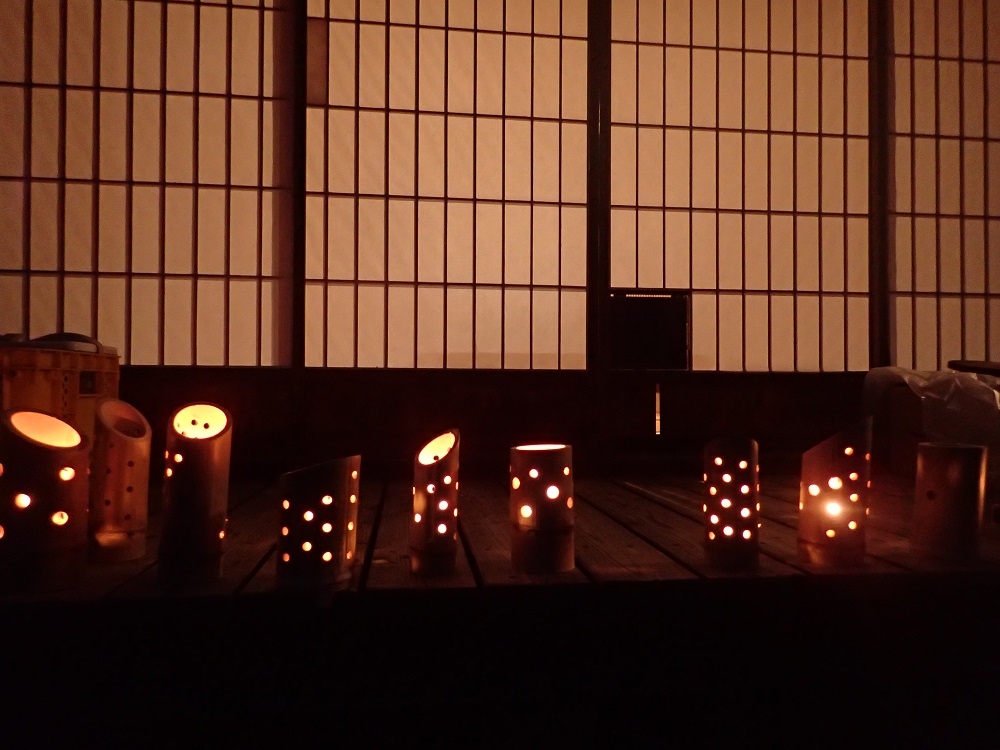 今回のキャンプに参加することを楽しみにしていた、今は天にいる仲間のことを思い、手作りの竹の灯篭を立てて追悼のひと時も持ちました。。