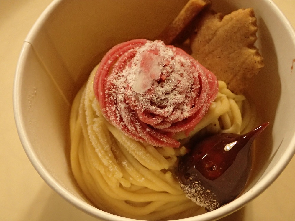 そして、甘露煮とペーストを使いまして、百年栗のモンブランが完成です!