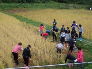 それから稲刈り体験に移動しまして、、あいにくお天気が崩れて雨になってしまったのですが、子どもたちと一緒に無事稲を刈り終えることが出来ました!