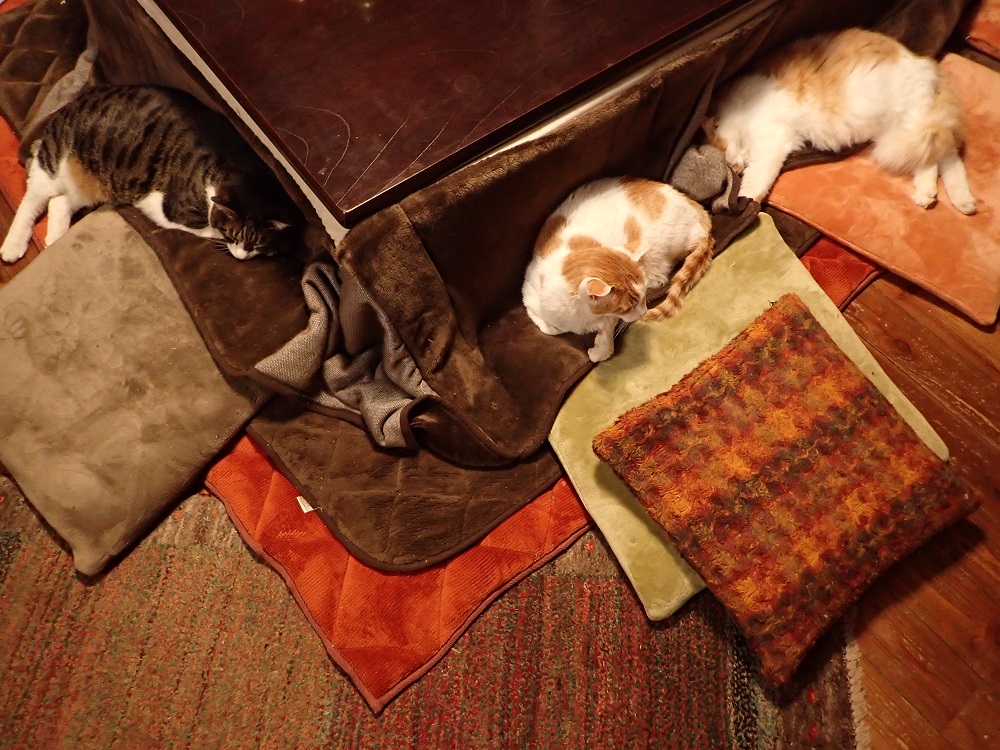 おこたの周りに集まって、それぞれにくつろぐ農楽里のにゃんこたちです。。