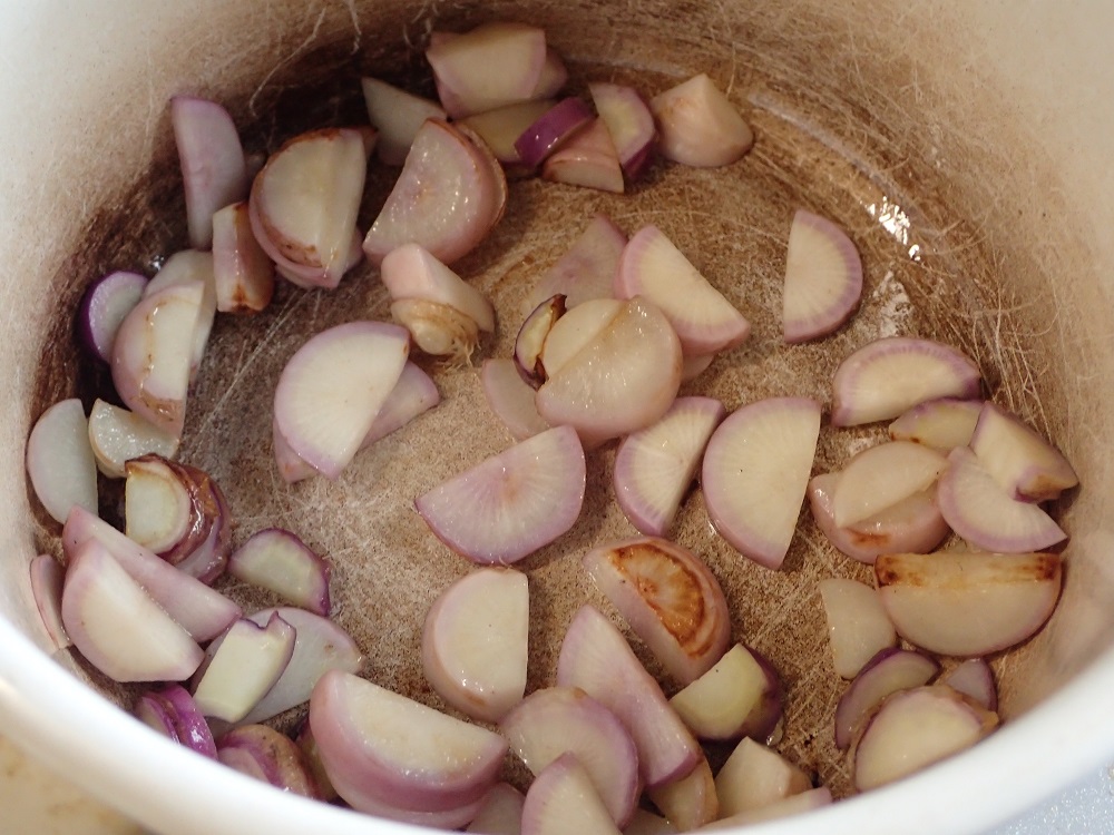 水分が少なくてゴリゴリとした感じのカブなので、軽くオリーブオイルでソテーをしてから煮込みます!