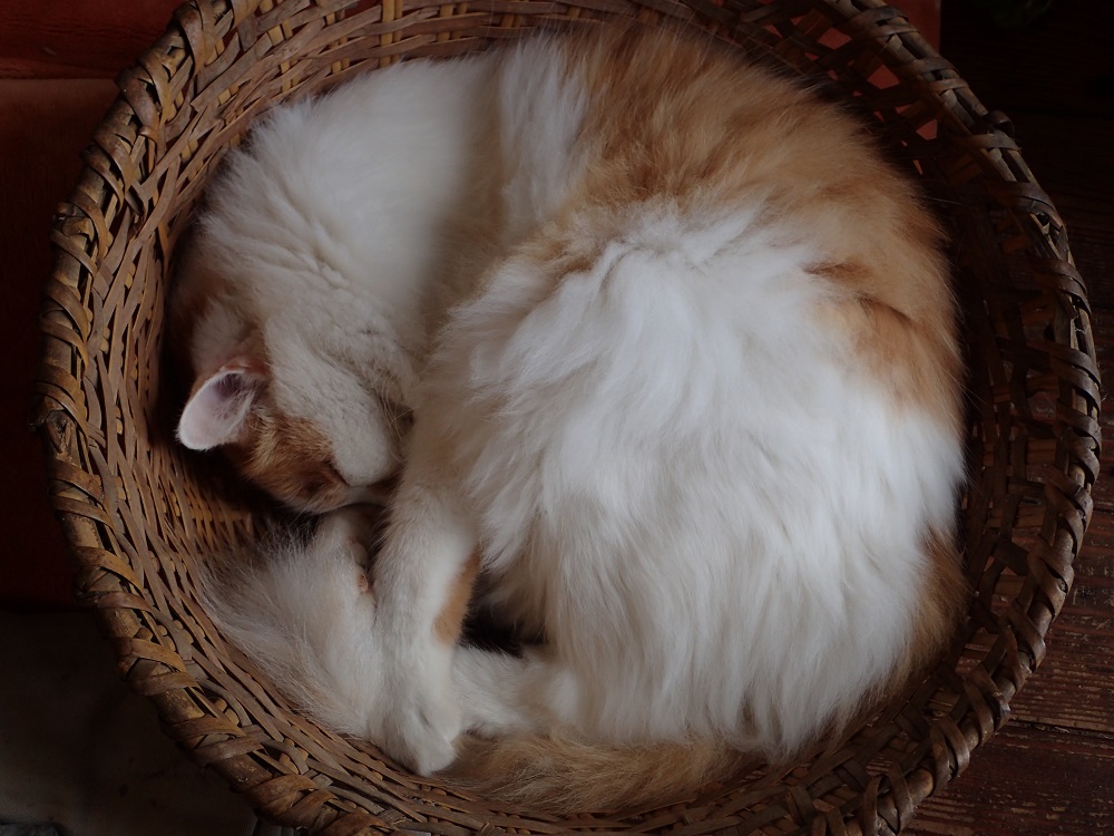 母屋の居間では、かごの中でミコ太が丸くなって寝ていました。
