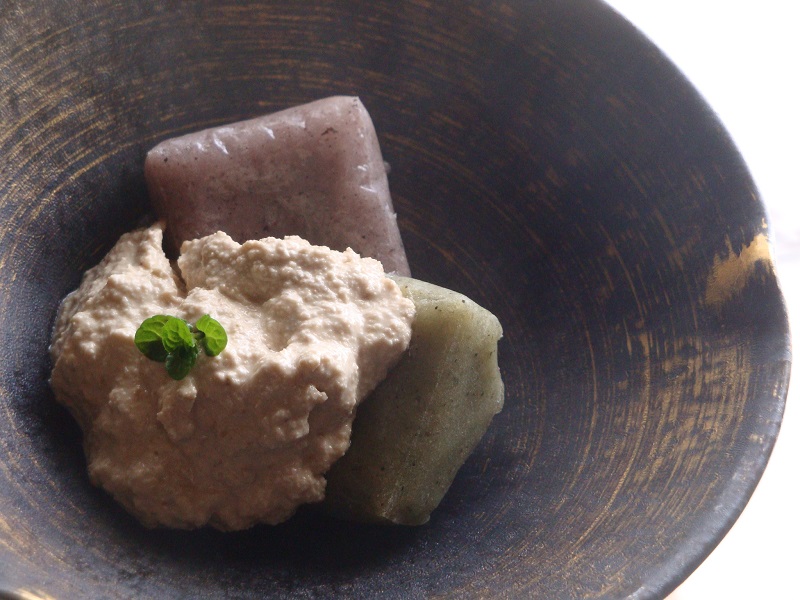 こちらは、黒米のうす紫とヨモギの2色をくるみ餅にしてみました!