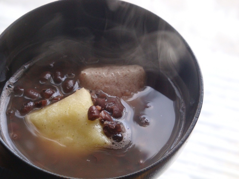 こちらのお汁粉は、赤米のピンク色ときび餅ですね!