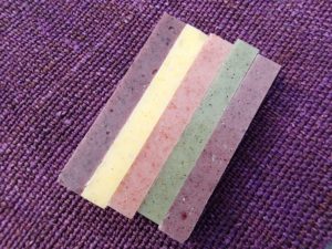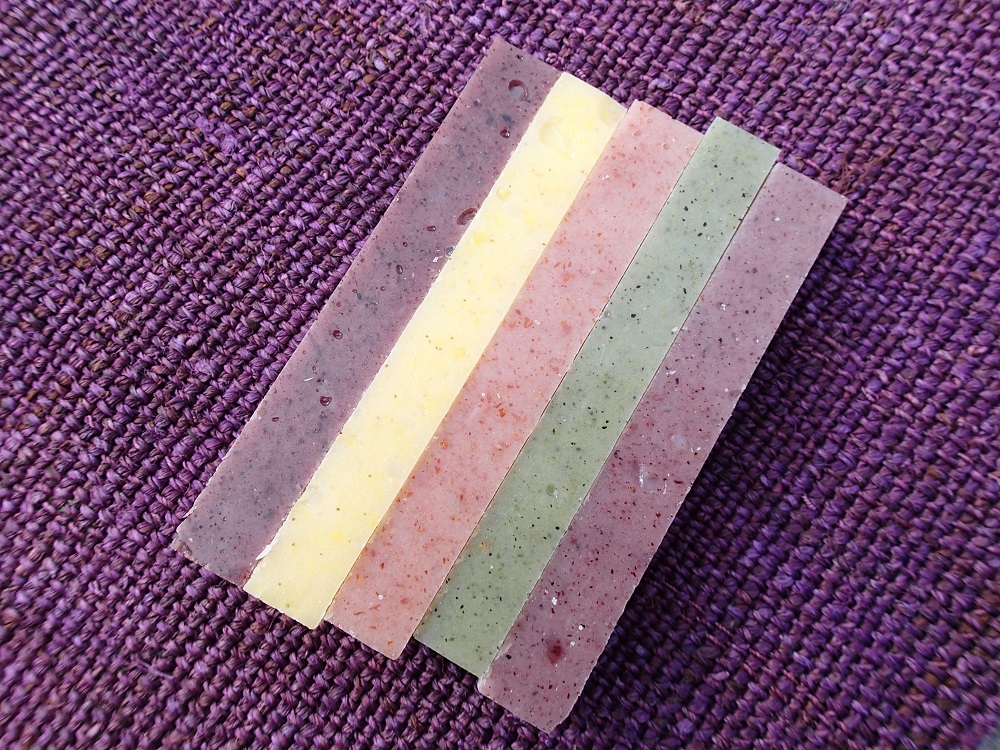 緑はヨモギ、ピンクは赤米、うす紫と紫は黒米、黄色はもちきびを使用しております。