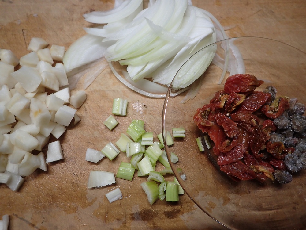 ① 玉ねぎは千切りに、トピナンブールとセロリは、トゥベッティと同じ大きさ位にカットする。