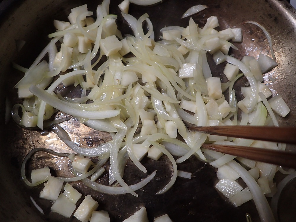 ② オリーブオイルで、玉ねぎとトピナンブールをしんなりするまで炒める。