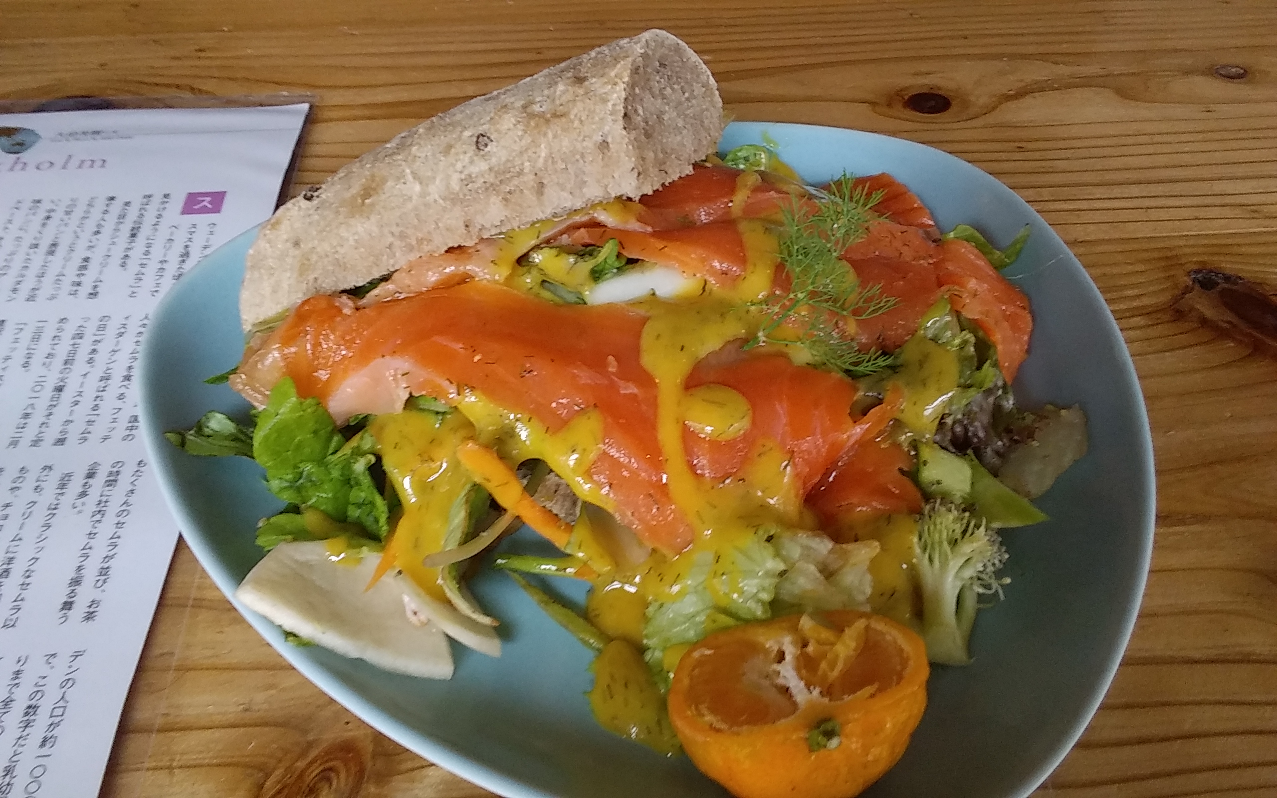 自家製パンにたっぷりの生野菜と大きなサーモン、そして手作りのドレッシングがとても美味しいサントウィッチを頂きました!添えてありますのは、完熟シークワーサー。