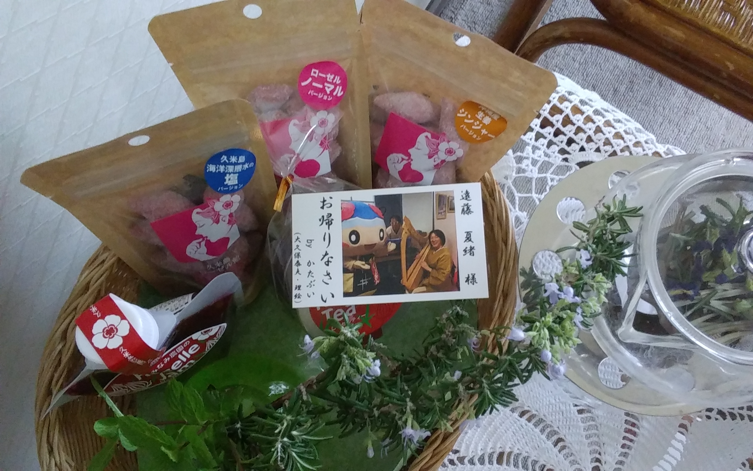 「お帰りなさい」のメッセージカードともに、八重さんが栽培しているローゼルを使ったローゼルティーにローゼルジャム、そしてローゼルの飴のセットでした!