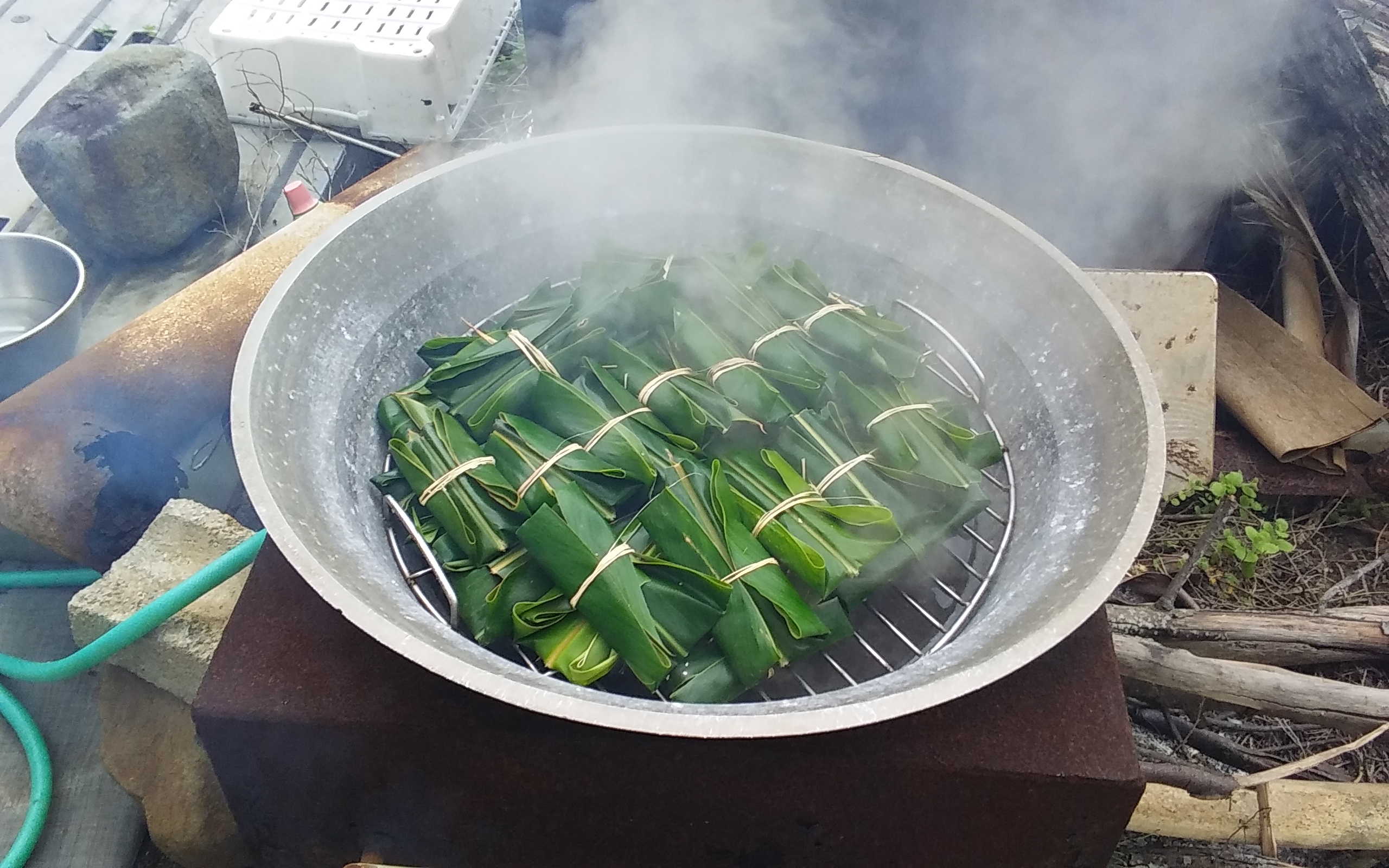 月桃の葉には殺菌作用や抗菌作用があるそうで、独特の香りがあります。その香りを浴びながら、竈で蒸し上げ中。