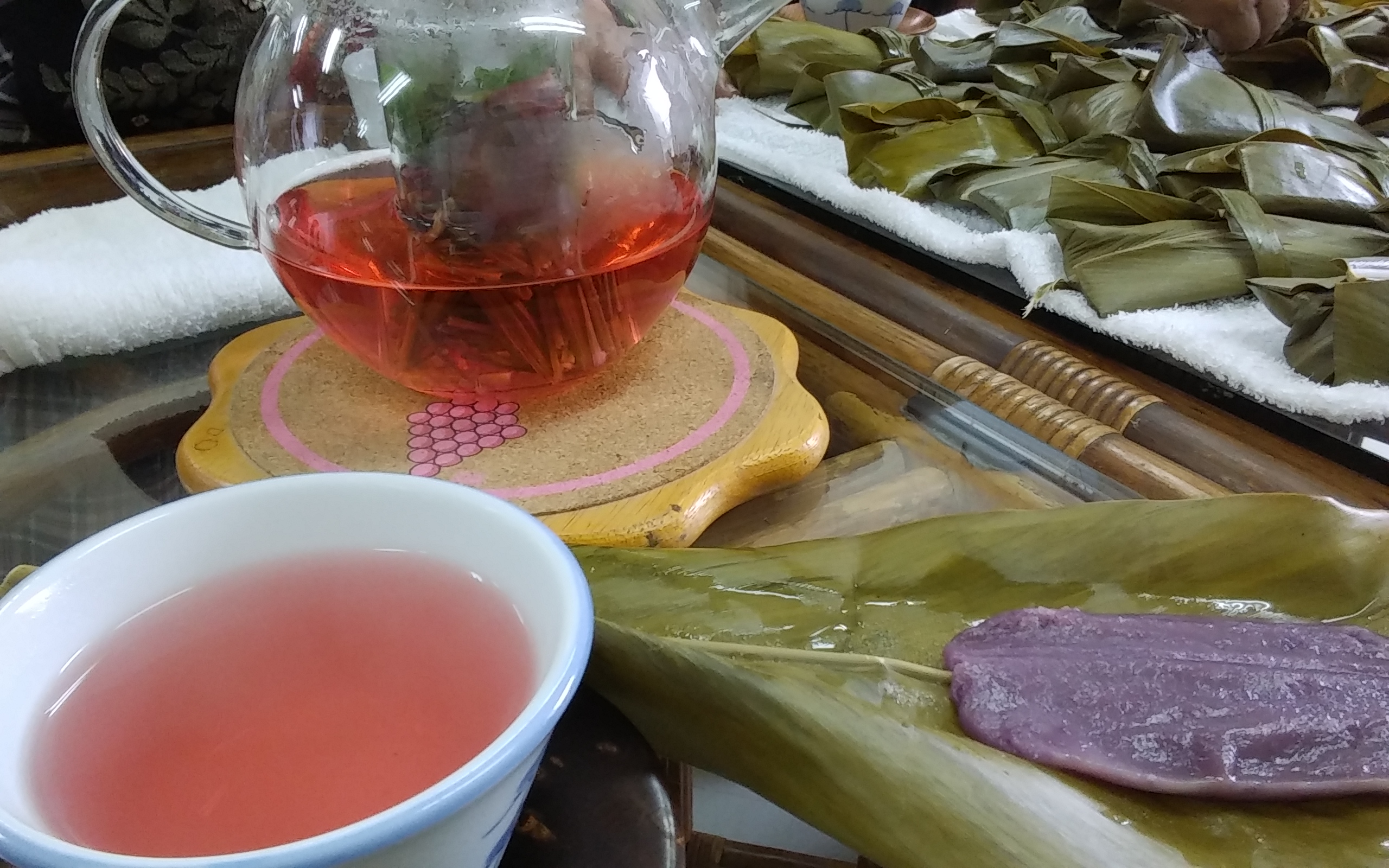 蒸しあがったムーチーを、ローゼルティーと一緒に頂きました!