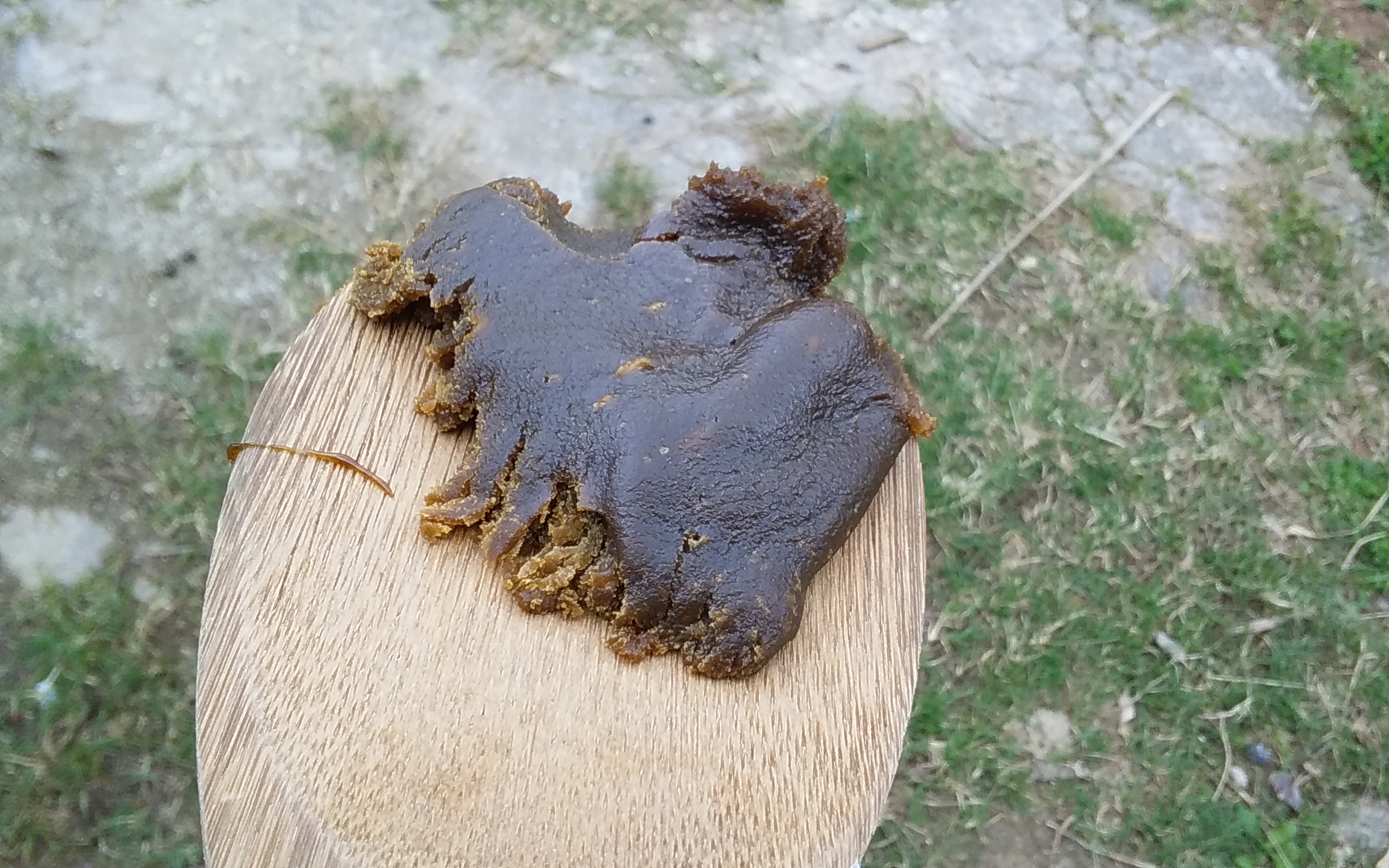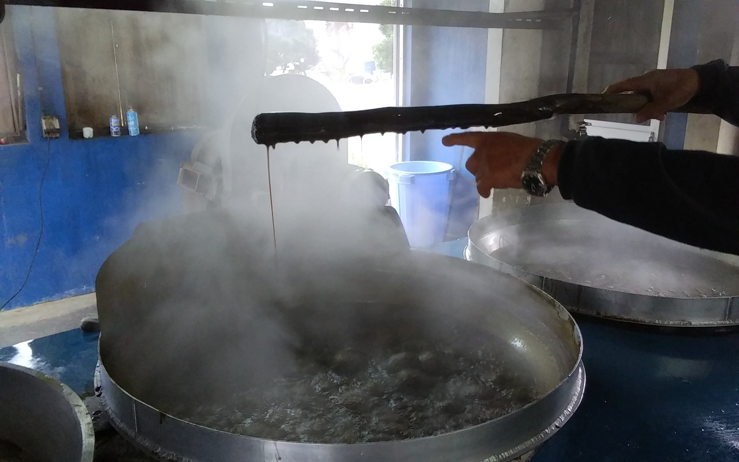 撹拌する棒からしたたり落ちる黒糖の粘度を見て、飴になる具合を計ります。