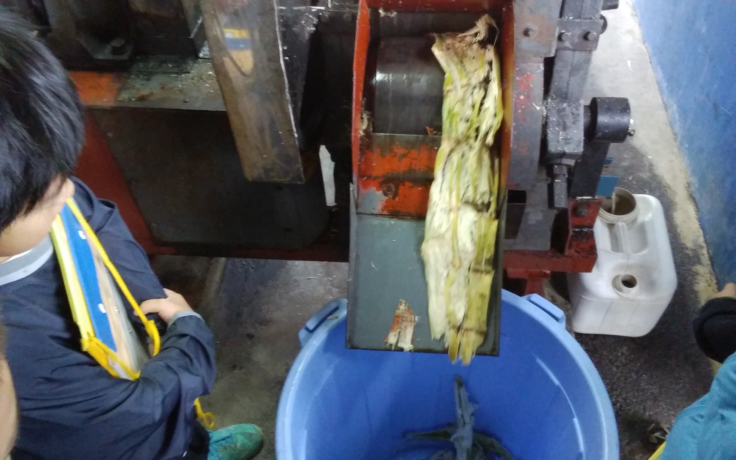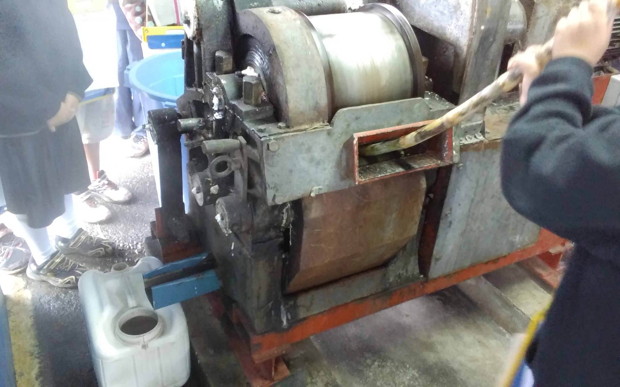 まず、収穫したサトウキビを一本ずつ圧搾機にかけて、サトウキビジュースを絞り出していきます。