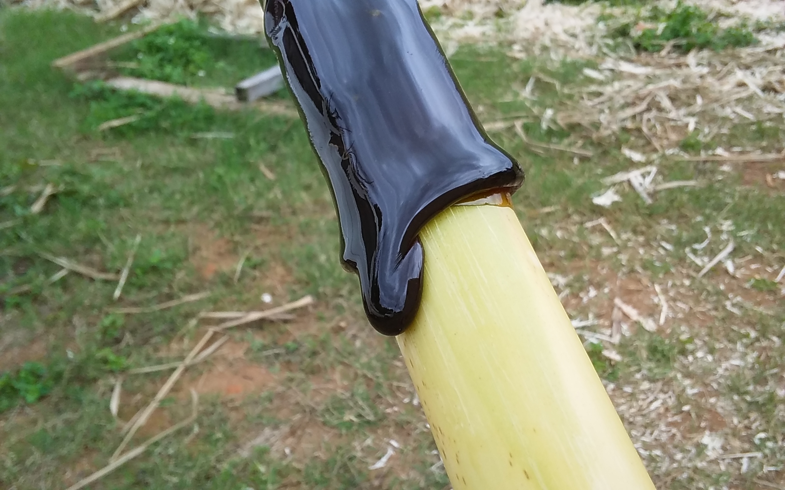 それから、サトウキビの茎に飴状になってきた黒糖シロップを絡めまして、、