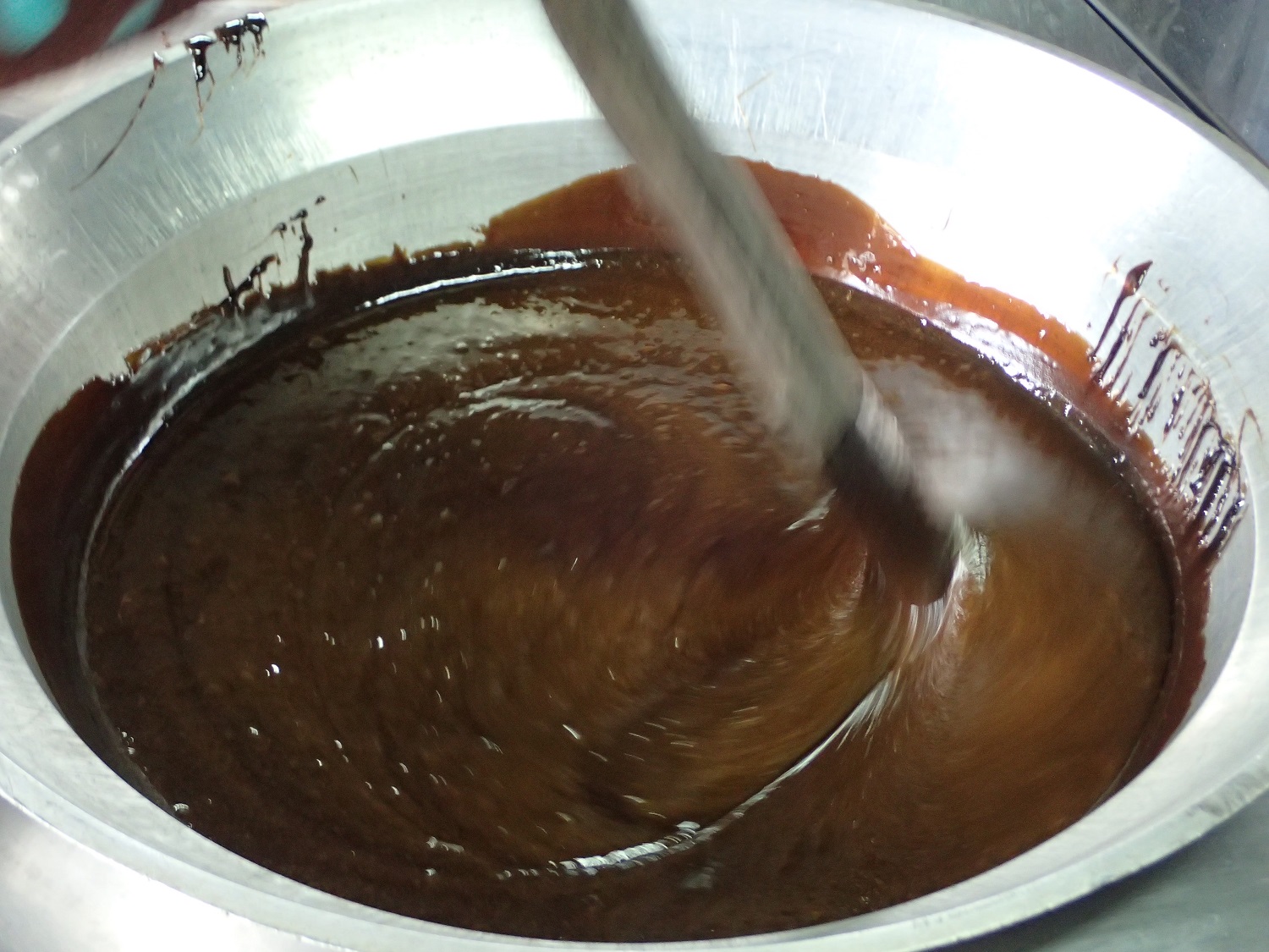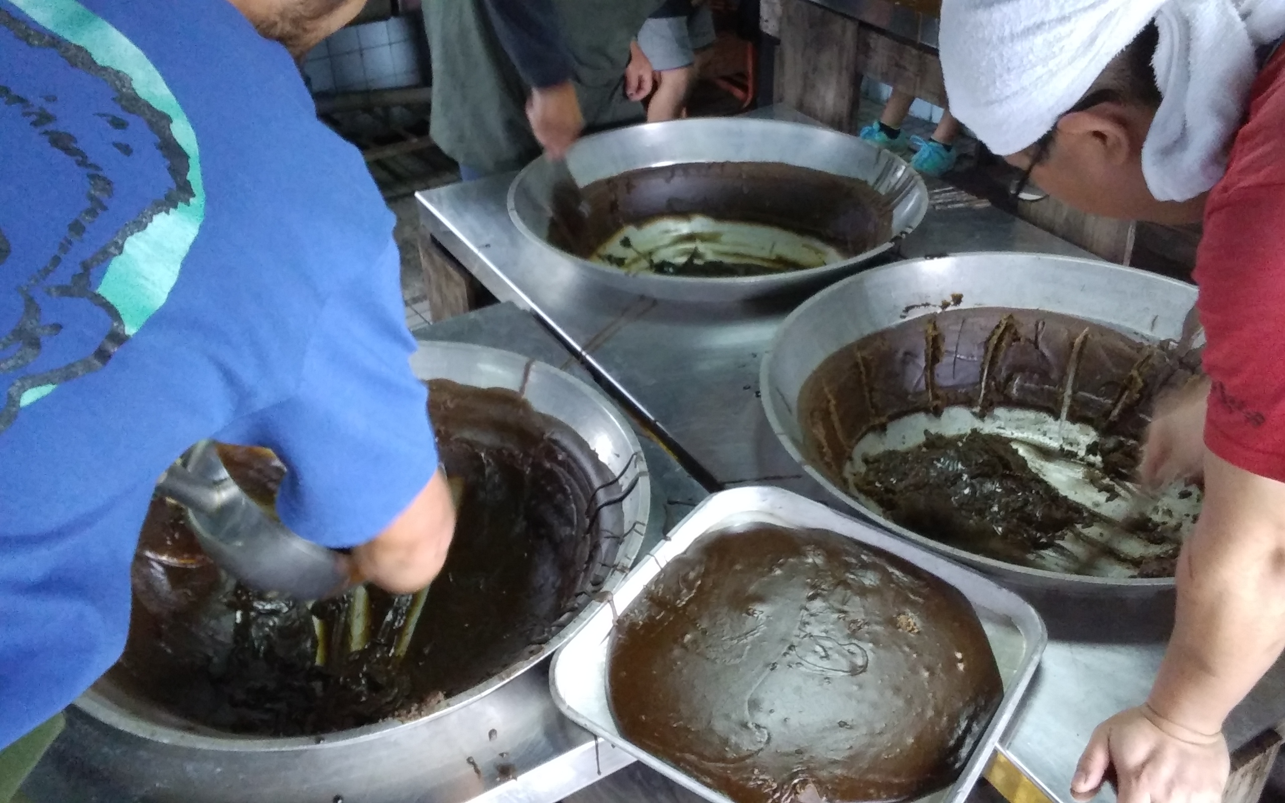 さて、、煮詰まってきた黒糖シロップを、ちょうどよい頃合いで冷まし始めます。