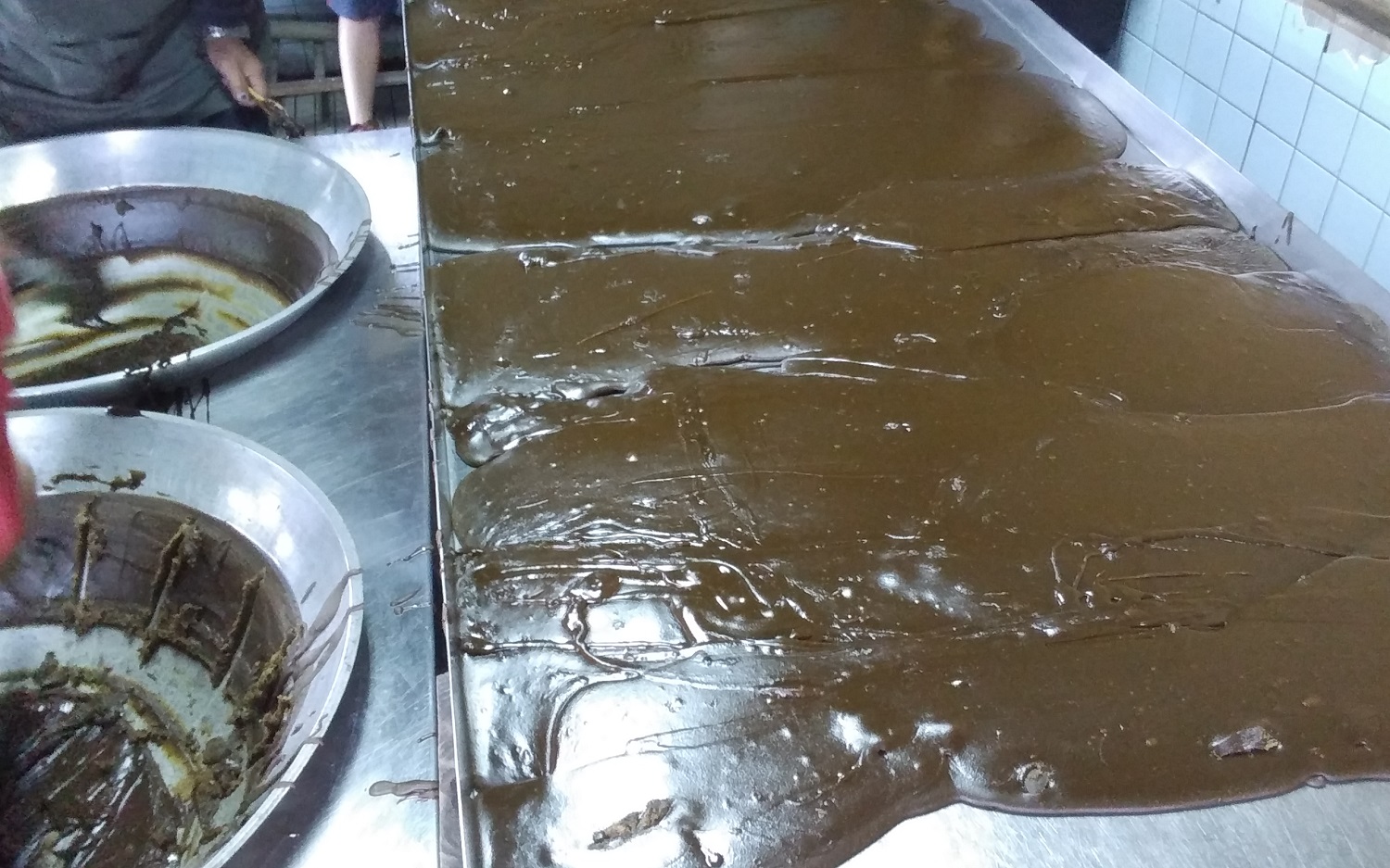 平らなステンレスの大きなバットに注いでいきます。