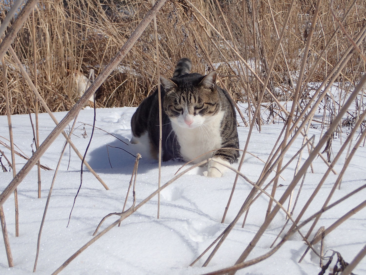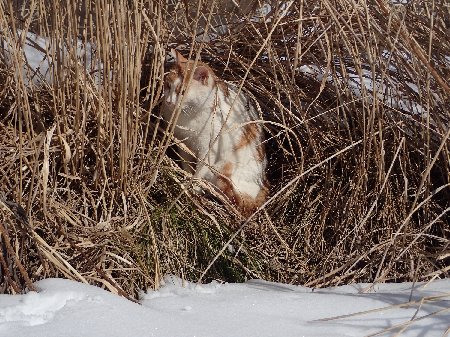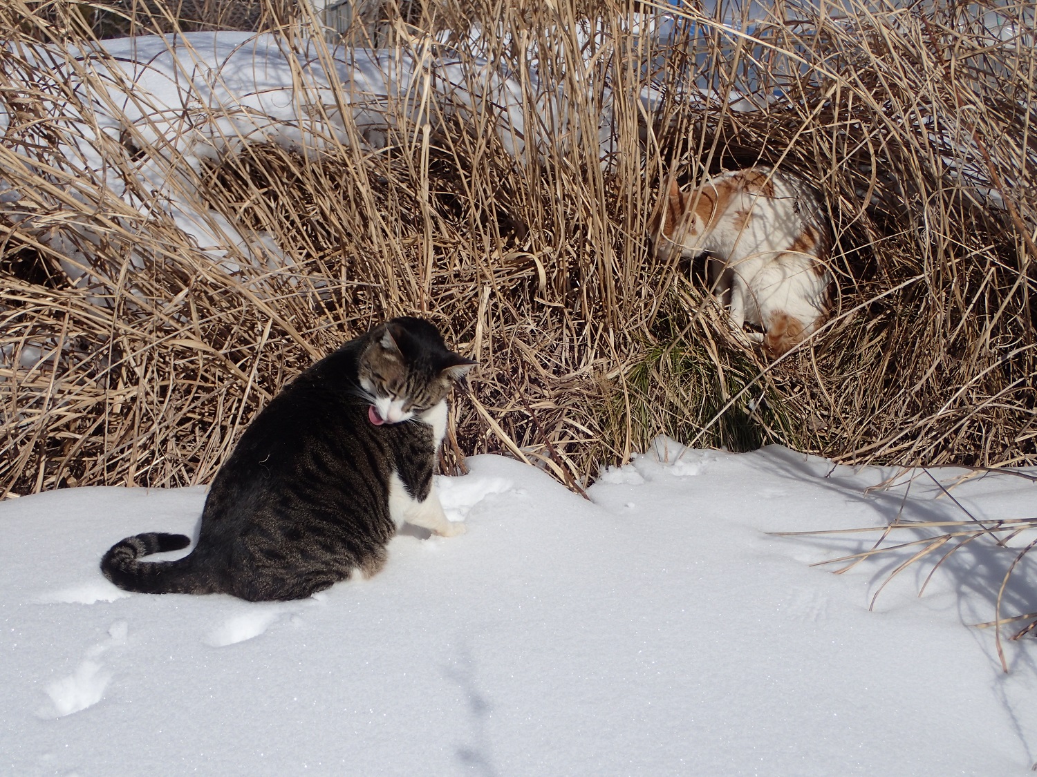 すぐに、雪が解けて枯れ草が出ている陽だまりを見つけまして、よっこらしょと腰を下ろし、「あー冷たかった!」と、真っ赤になった肉球をぺろぺろと。。