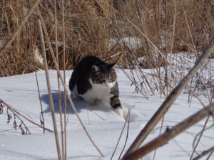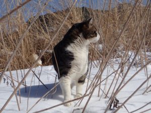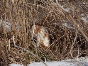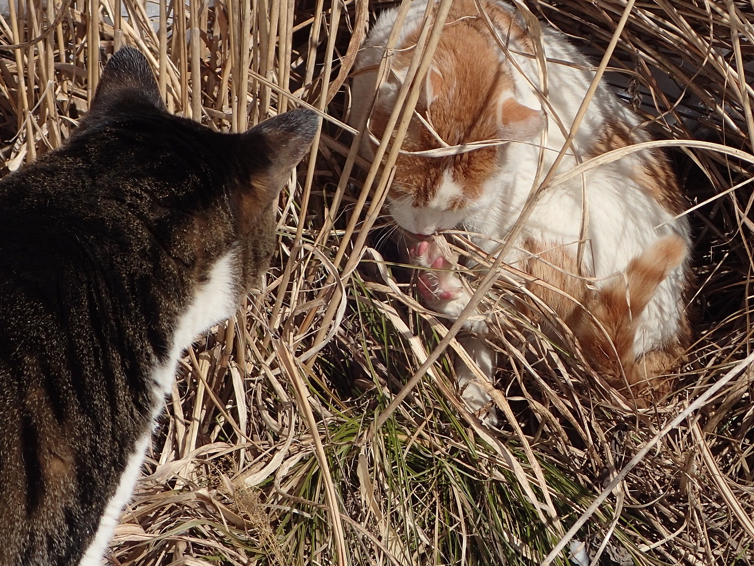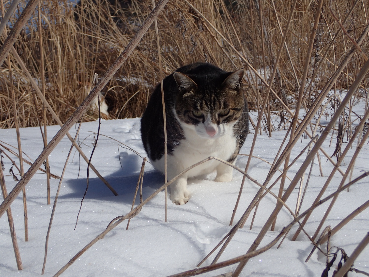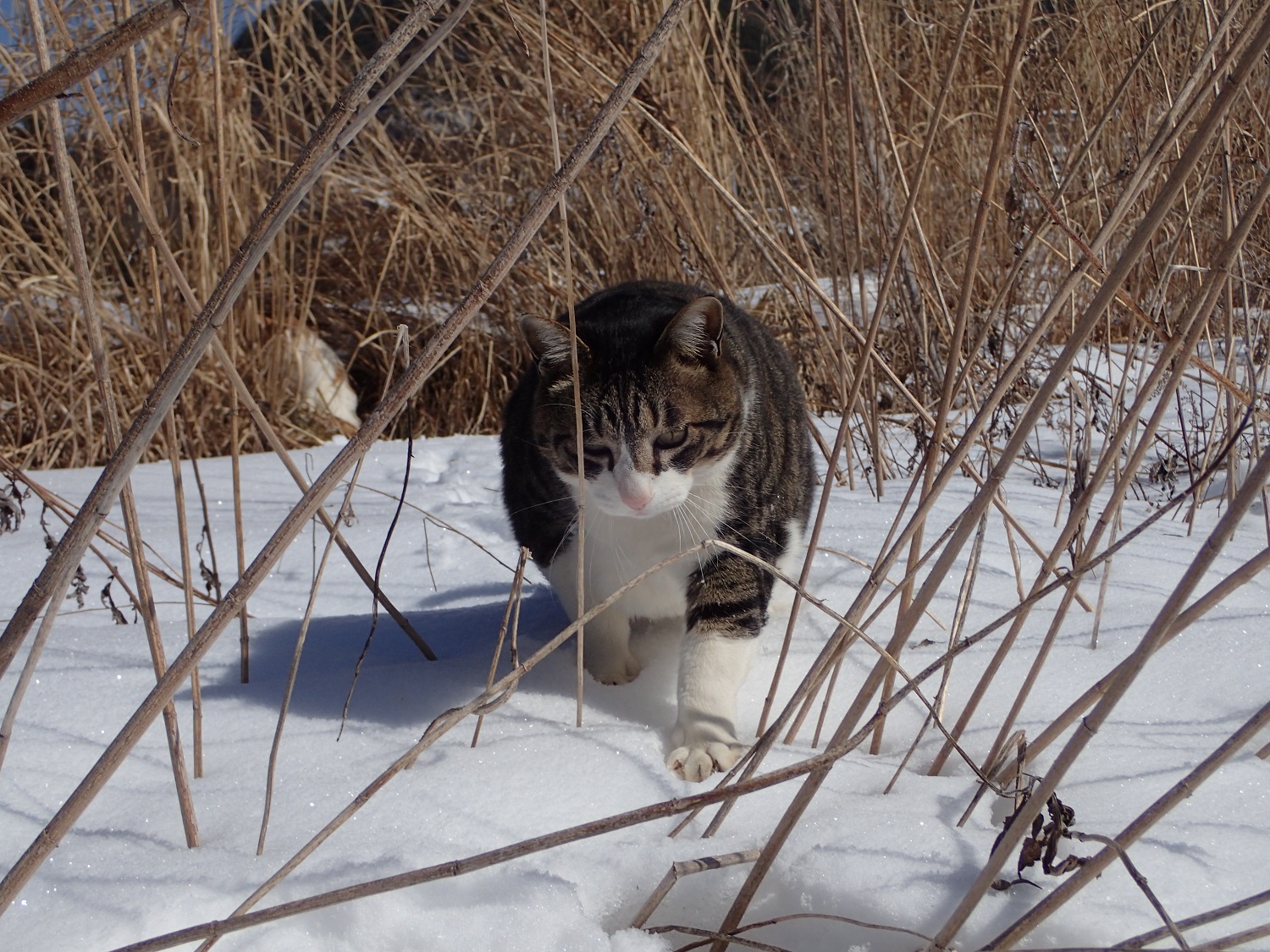 すぐに、雪が解けて枯れ草が出ている陽だまりを見つけまして、よっこらしょと腰を下ろし、「あー冷たかった!」と、真っ赤になった肉球をぺろぺろと。。