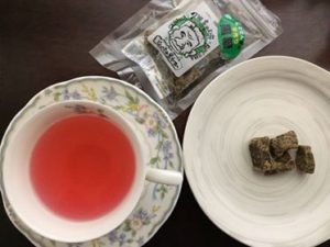 久米島みなみ農園さんの無農薬のローゼルティーと、おやつ村の「じぃーまの黒ざーた」を組み合わせました、久米島ティータイムセットのご感想が、写真と一緒に届きましたです!