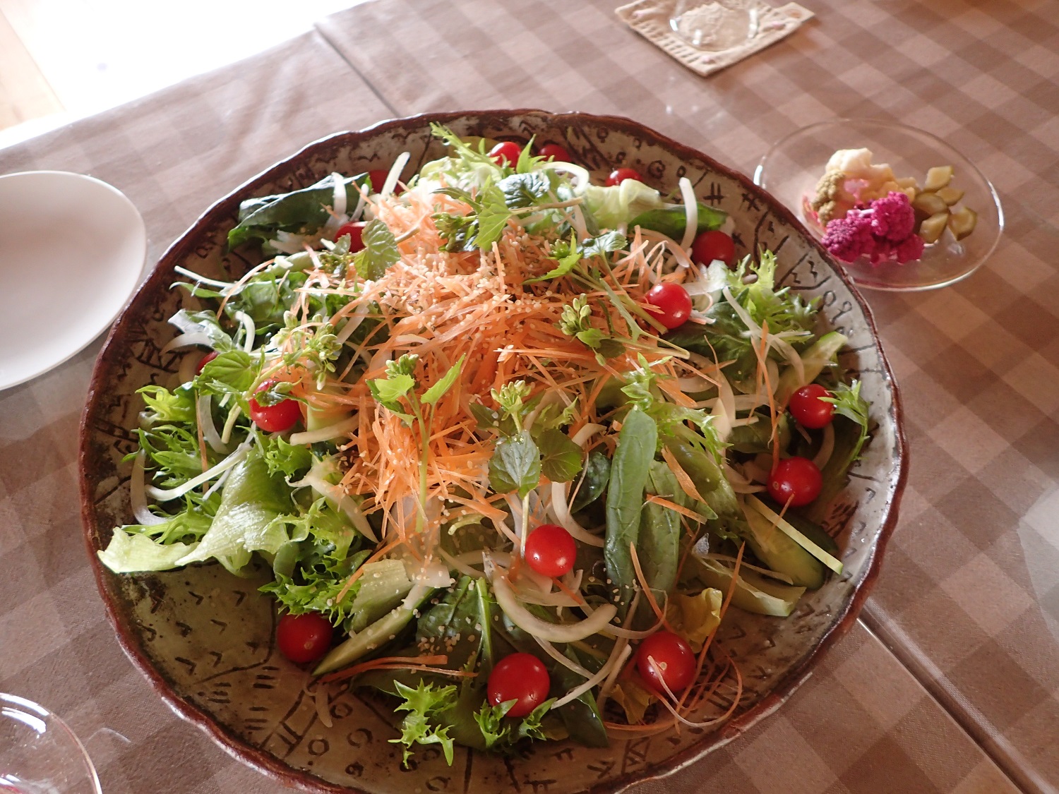 そして、野菜サラダ。今、農楽里のお野菜はまだそろわないので、地場産、減農薬や有機のものを使用しています。