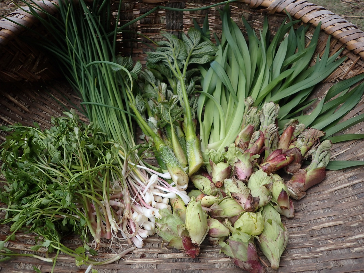 田セリ、アサツキ、山ウド、ノカンゾウ、フキノトウ、タラの芽、葉ワサビ。