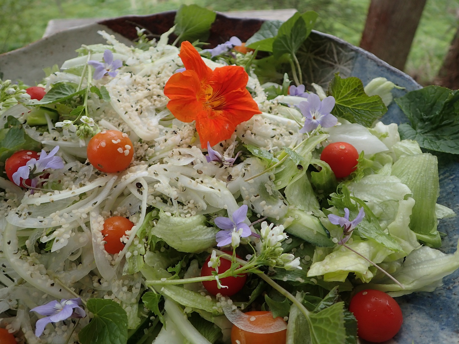 まだ農楽里のお野菜が出そろっていないので、サラダは、地場産の減農薬のものを中心に、葉ワサビや野生のスミレの花をあしらいました。