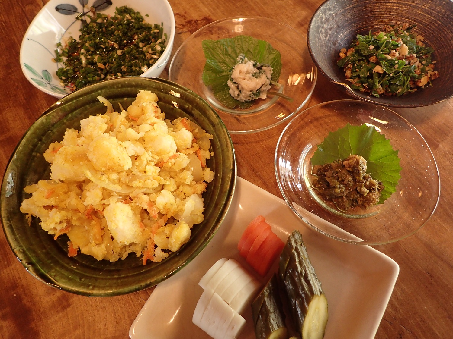 3種類のジャガイモのカレー風味のサラダに、アサツキのごま油和え、葉ワサビの酒粕漬けヤマウコギとクルミの和え物、ふき味噌、、、