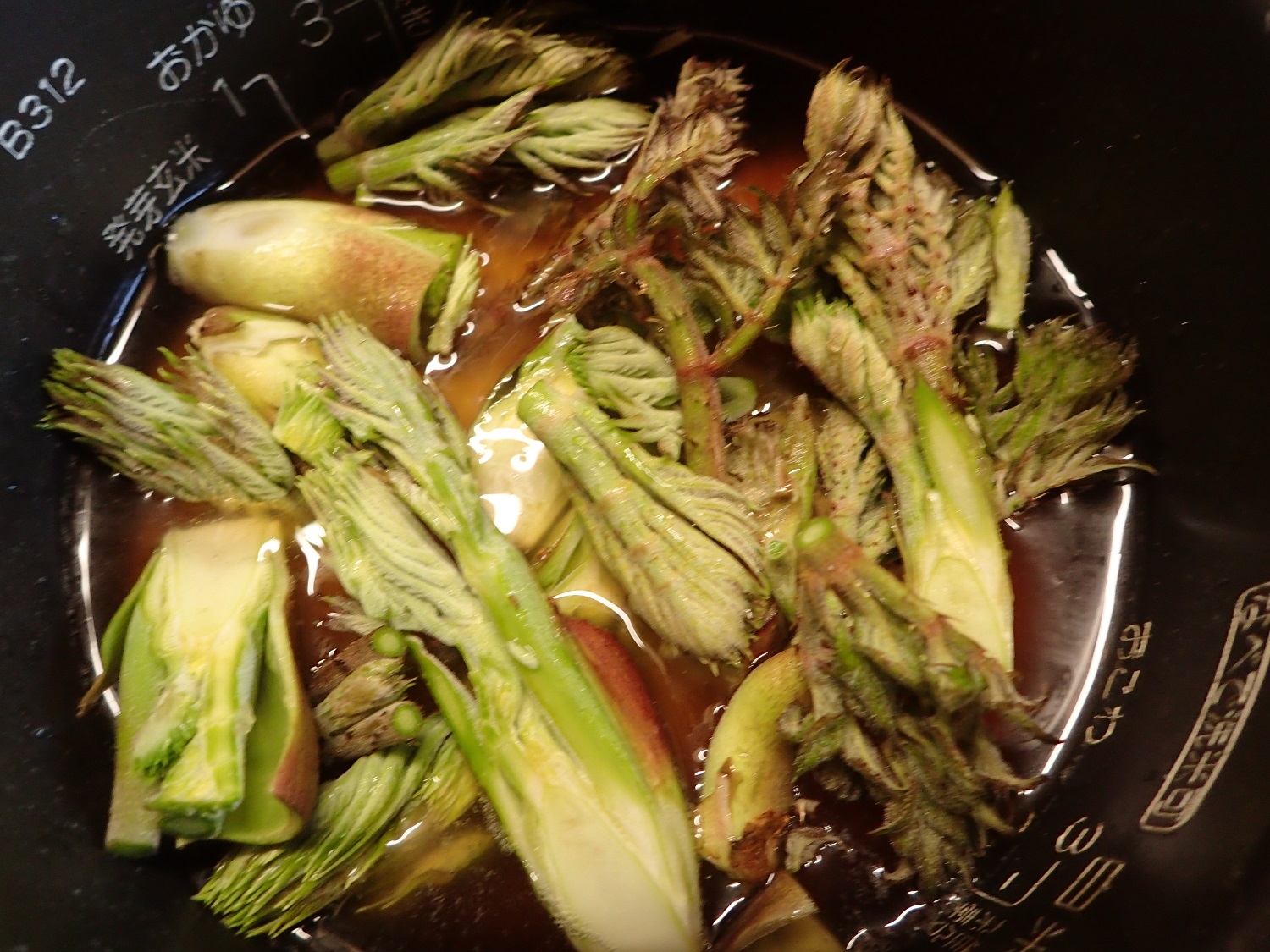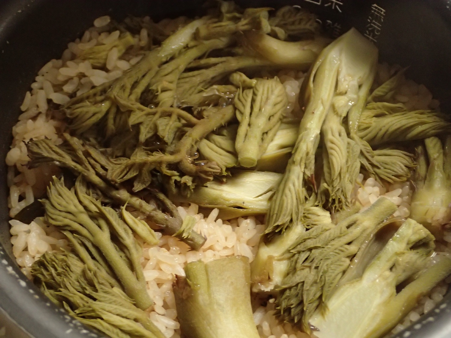 3.その上に、分量のタラの芽を4~5センチくらいにカットして置き、普通に炊飯する。